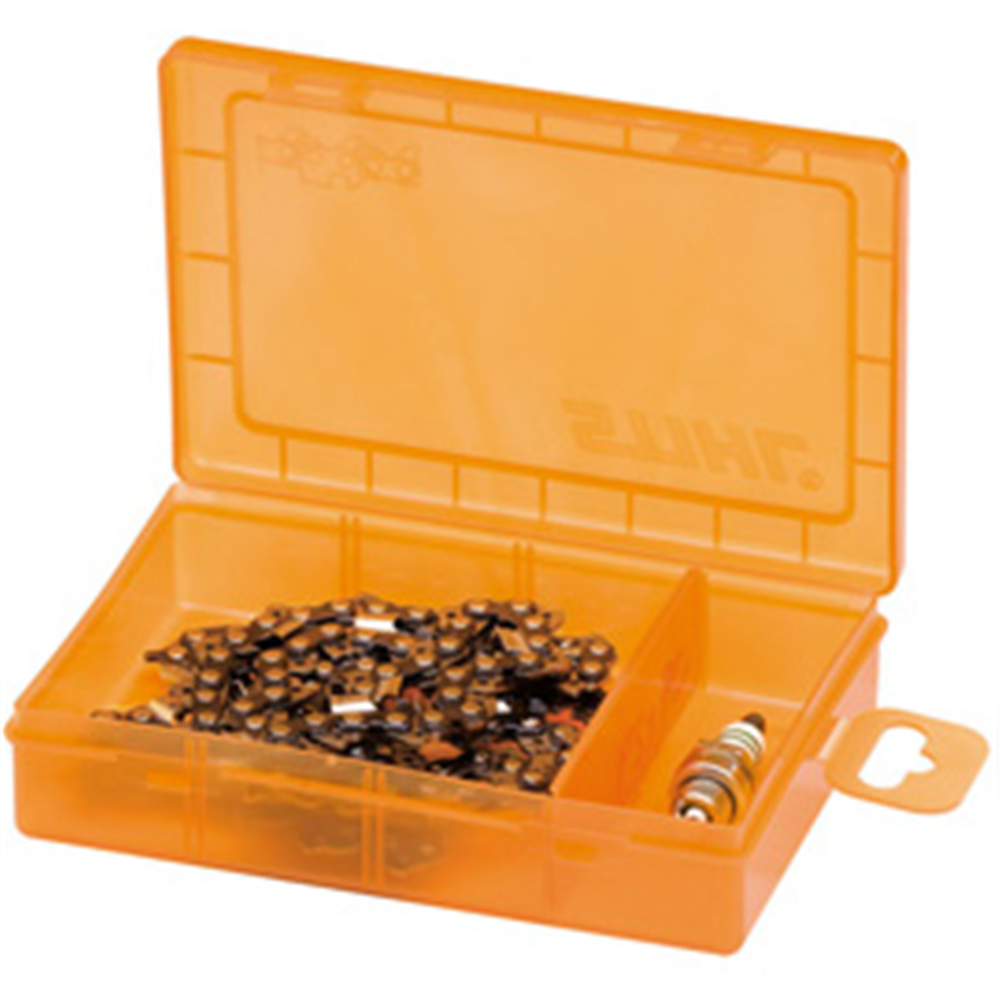 Lanci testere su zaštićeni od oštećenja u robusnoj STIHL kutiji za skladištenje. Kada vam ne treba vaš lanac motorne testere, možete ga bezbedno skladištiti u kutiji. Zahvaljujući 2 graničnika, ovaj praktični dodatak motorne testere može se takođe koristiti za skladištenje lanca testere i manjih alata ili dodataka za održavanje, poput svećica. Zasebne pregrade garantuju da se proizvodi neće međusobno oštetiti, posebno tokom transporta ili kada premeštate kutiju lanca testere. Transparentna plastika znači da odmah možete da vidite sa spoljašnje strane koji dodaci su u kutiji za skladištenje.