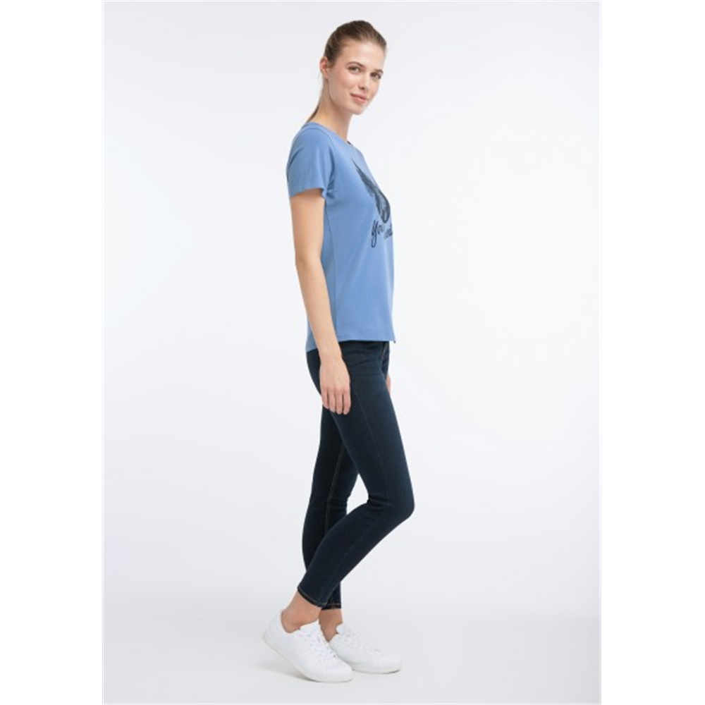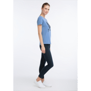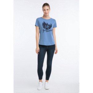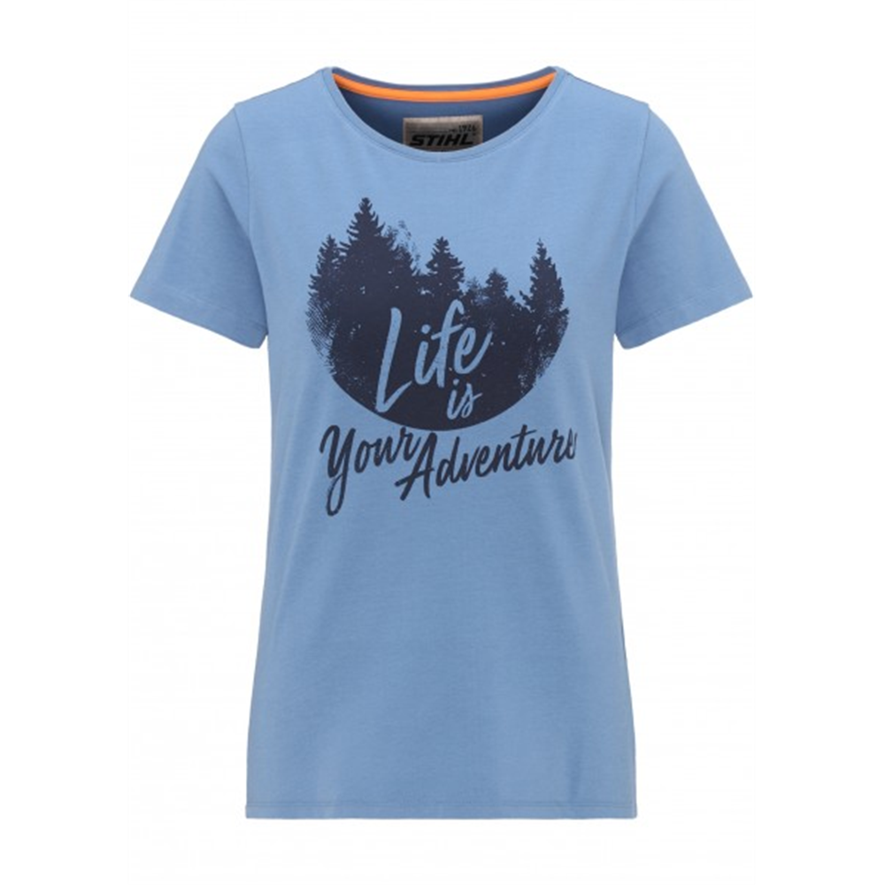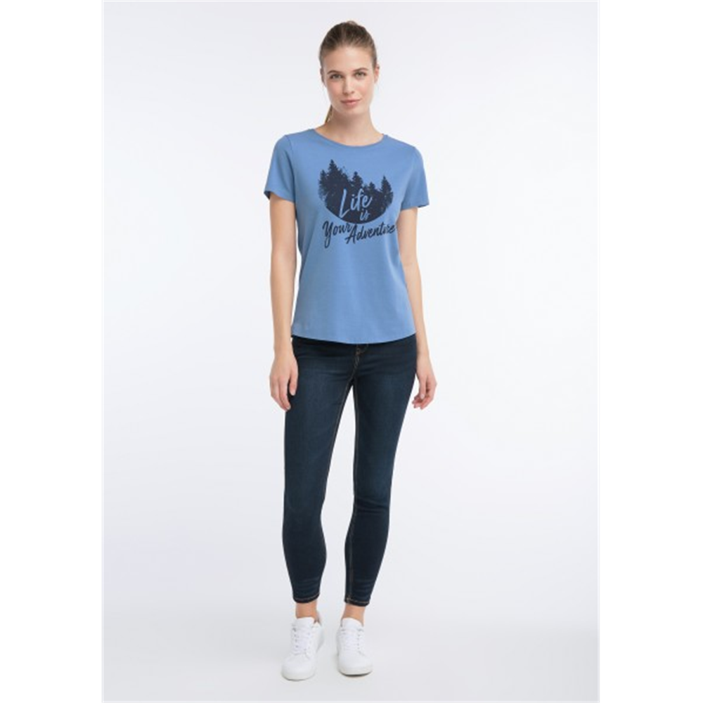 Na avanturu! Naša plava majica napravljena od 95% pamuka i 5% elastana govori upravo to! Ugodna kombinacija materijala ili atraktivan prednji print s motivom jele i LIFE JE VAŠA ADVENTURA slovima čine majicu popularnom mustrom.