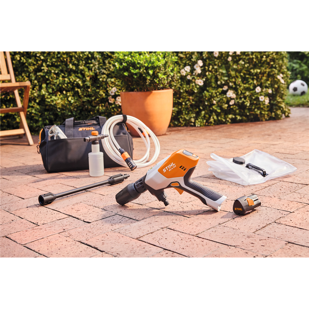 Ako već nemate bateriju i punjač iz STIHL AS sistema, vredi kupiti STIHL RCA 20 uređaj za pranje pod pritiskom u kompletu sa dve STIHL AS 2 baterije i STIHL AL 1 standardnim punjačem.