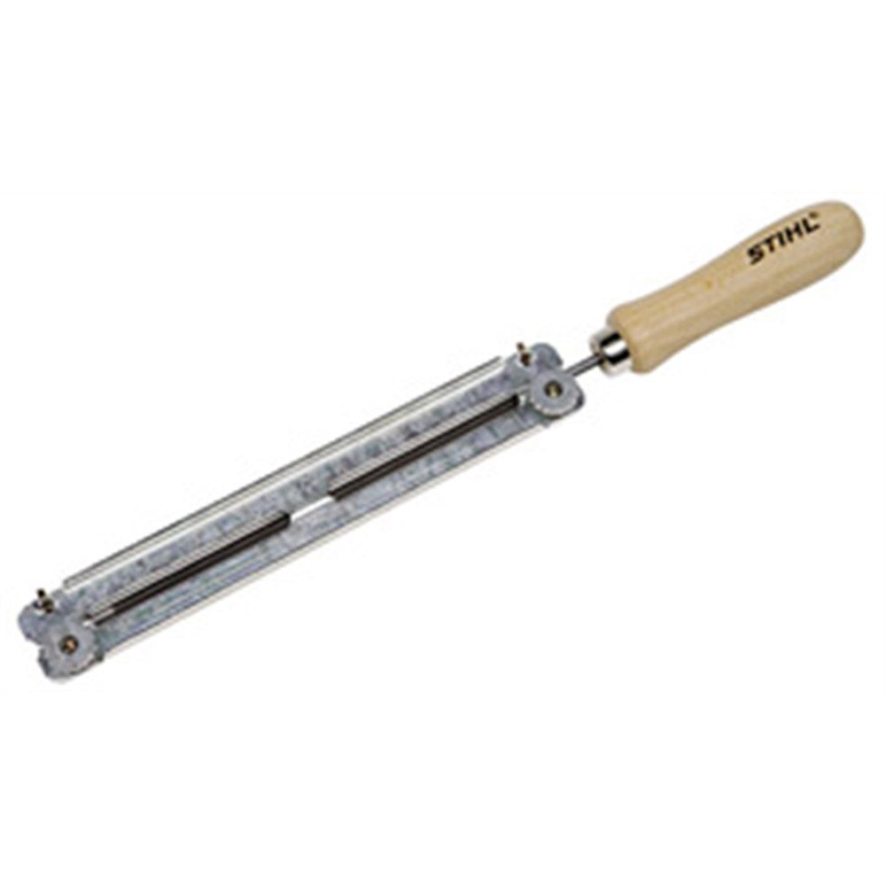 STIHL držač turpije sa okruglom turpijom (za lance testere) pomaže vam da oštrite motornu testeru i koristite pravilan ugao oštrenja na lancu testere.