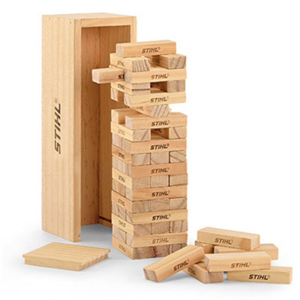 Dobri živci i mirna ruka ! Ovo zahteva klasična igra slaganja u Stihl izvedbi. Toranj za slaganje izrađen od drveta bora certificiran FSC-om zahtijeva mirnu ruku i omiljena je igra veštine za mlade i stare. Sve 54 pločice kao i kutija za odlaganje isporučene su laserski ugraviranim Stihl logotipom.
