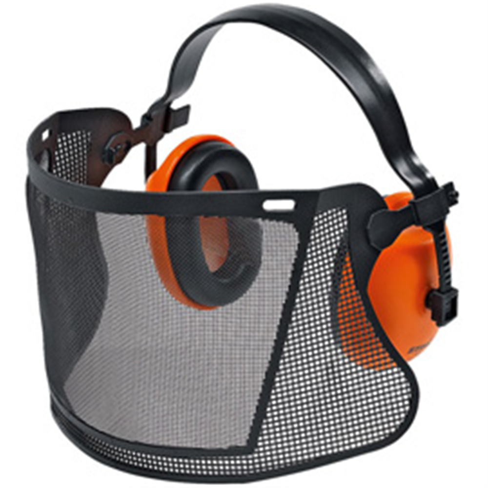 Laka kombinacija za zaštitnim slušalicama za dobro prigušivanje buke (do 104 db(A)) i pokretnim najlonskim vizirom. Podesivi okvir. Zastita usiju SNR 24 (H:28.