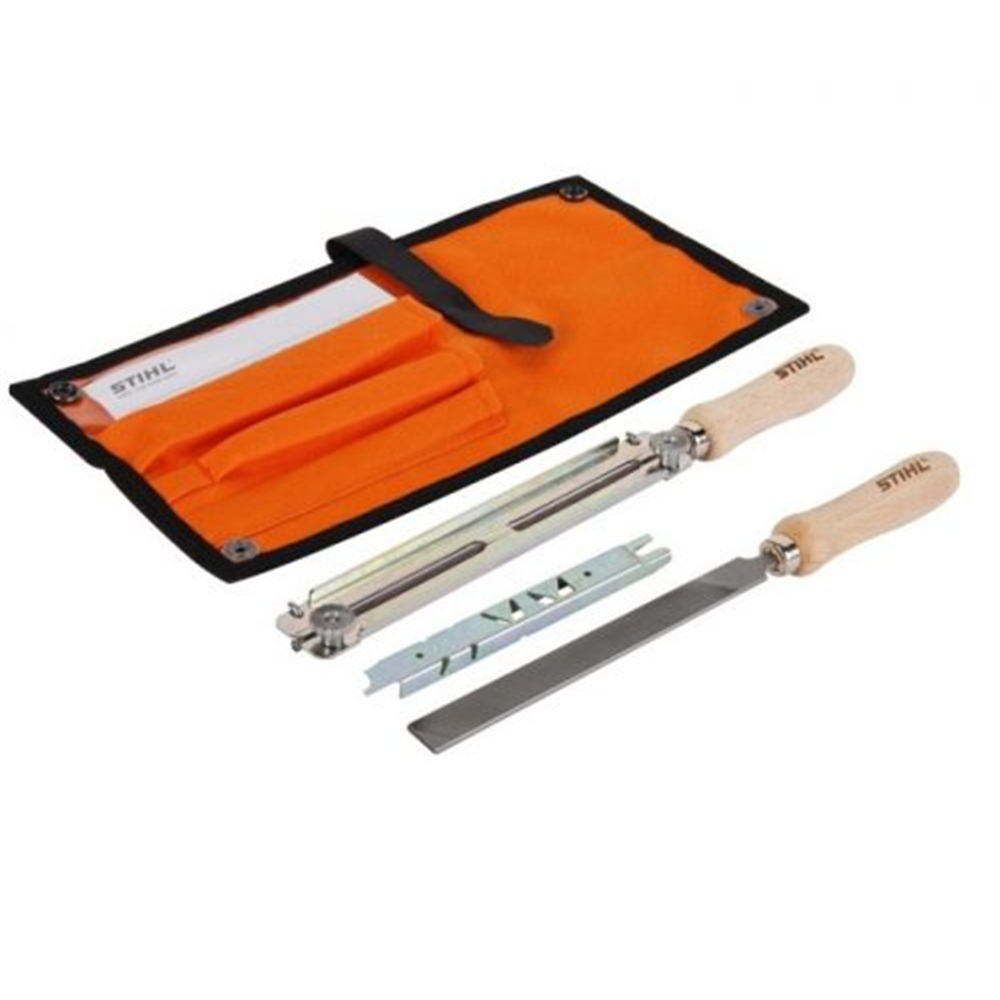 Komplet za oštrenje 3/8″ Sastoji se od držača turpija sa okruglom turpijom pljosnatom turpijom i graničnikom za skidanje kaljka lanca u torbi. Br.