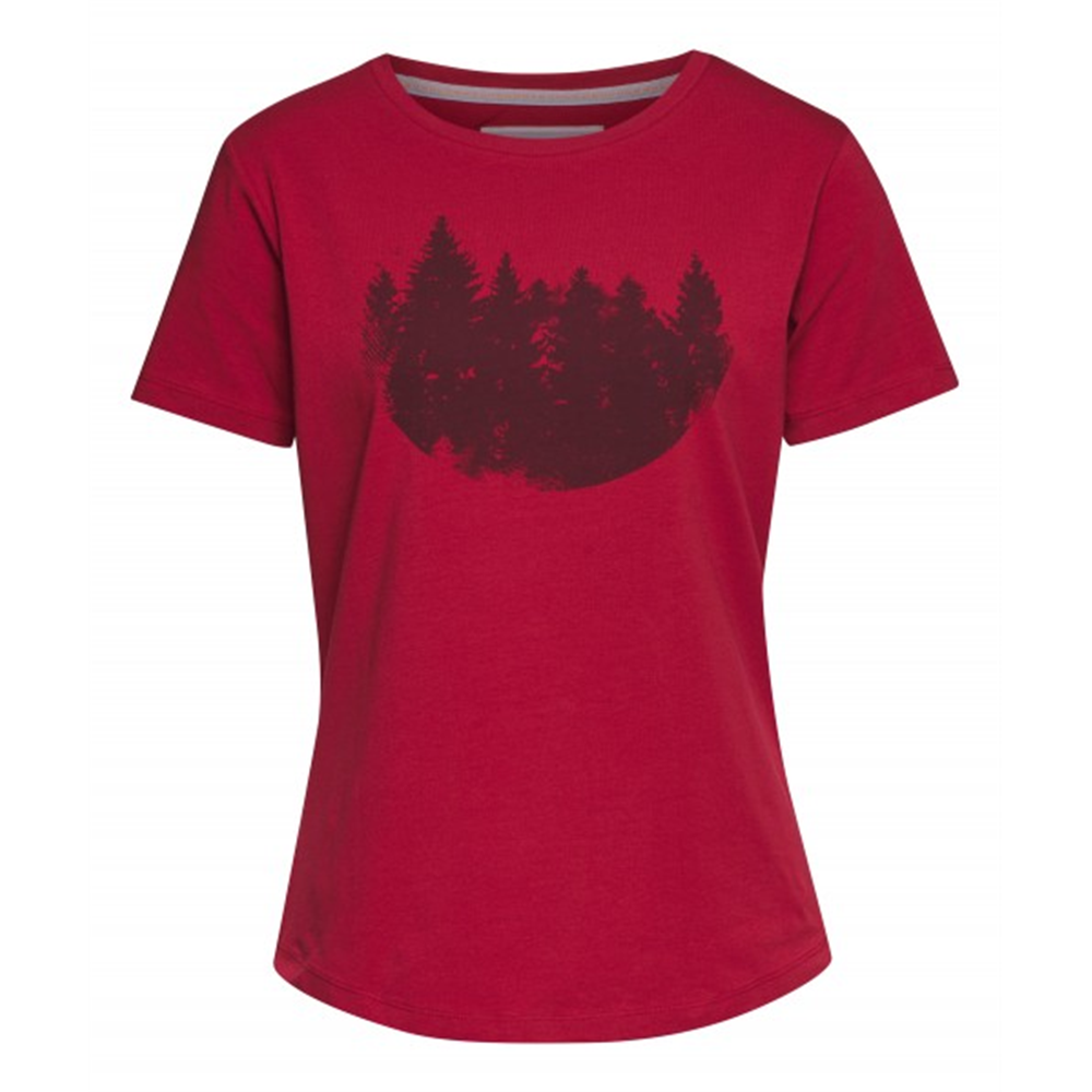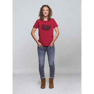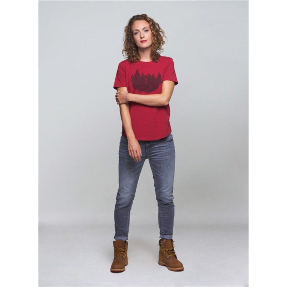 Ležerna crvena majica okruglog vrata sa suptilnim šumskim printom na grudima. Ugodna mešavina materijala od 95% pamuka i 5% elastana čini majicu novim favoritom.