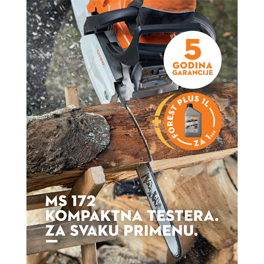 Dužina vodilice 30 cm Pomeranja 32 cm3 Snaga 1 5/2 kW/KS Težina 4 5 kg 1) Odnos snage i težine 3 kg/kW Težina sistema 4 97 kg 2) Nivo pritiska zvuka 100 dB(A) 3) Nivo snage zvuka 111 dB(A) 3) Vibraciona vrednost levo 3 m/s2 4) Vibraciona vrednost desno 3 4 m/s2 4) Korak lanca testere 3/8 “ P MS 172 BENZINSKA MOTORNA TESTERA: KOMPAKTNA I RAZNOVRSNA U UPOTREBI Kada je u pitanju sečenje drva za ogrev ili održavanje terena kompaktna benzinska motorna testera STIHL MS 172 nudi vam fleksibilnu benzinsku testeru bilo da ste domaći korisnik ili profesionalac u hortikulturi i održavanju pejzaža ili trgovac.