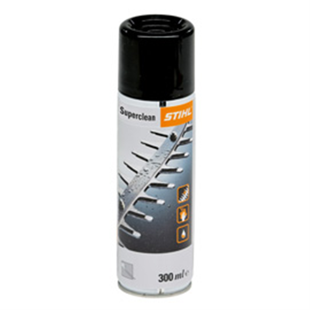 Sprej sa duplom funkcijom: Skidanje smole i prljavštine istovremeno sredstvo za podmazivanje i zaštitu od korozije. Za garniture za sečenje noževe makaze za živu ogradu i motorne testere. Superclean 300 ml Br.